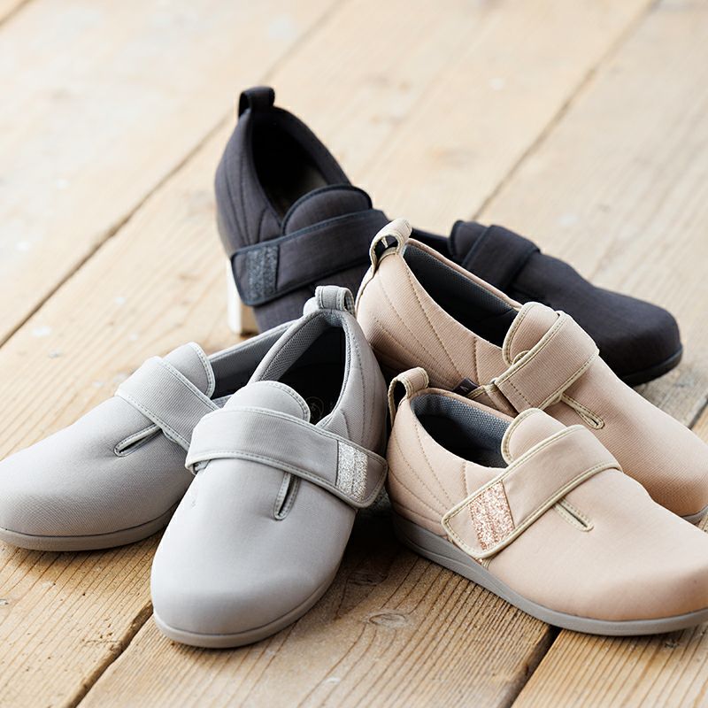 大人気のダブルマジックシリーズから上品なデザインの凛が登場。 流れるようなステッチとベルトや踵にあしらったラメが美しい一足です。