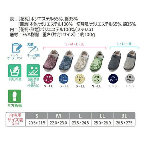 重さ: [片方:L]約100g(1足あたり、リンゴ1個よりも軽い!) 素材: ◆【織生地】:本体・・・ポリエステル100% 切替部分・・・ポリエステル65%綿35% ◆【花柄】 :本体・切替部分ともに・・・ポリエステル65%綿35% 底材: 合成底(EVA) ※当商品は日本で企画・設計し、日本、中国、ベトナム、ミャンマーで生産しております。詳しくは商品のサイズタグに生産国表示がございますのでご確認下さい。