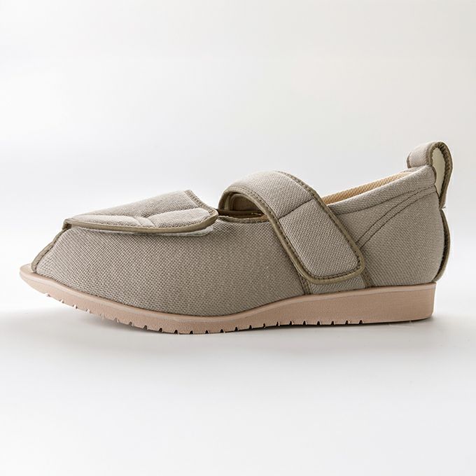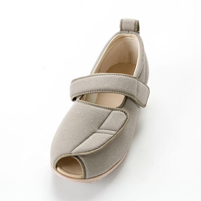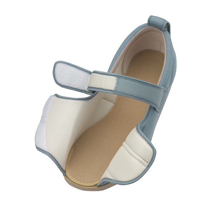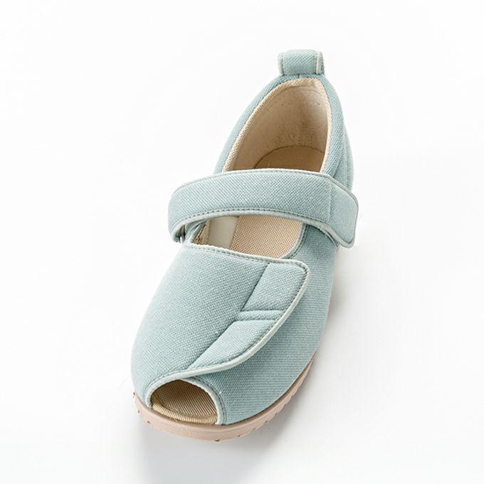 つま先が全開するとともに甲と足首2つのベルトが履き心地を安定させます。