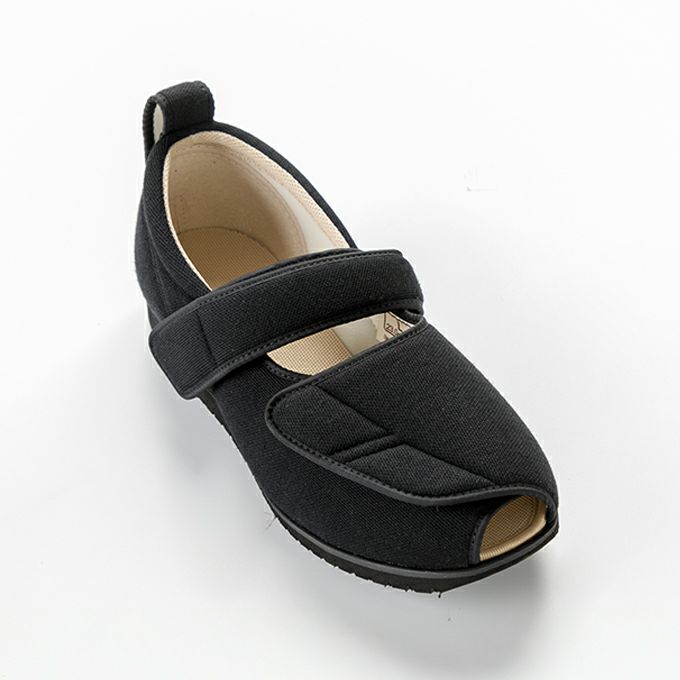 つま先が全開するとともに甲と足首2つのベルトが履き心地を安定させます。