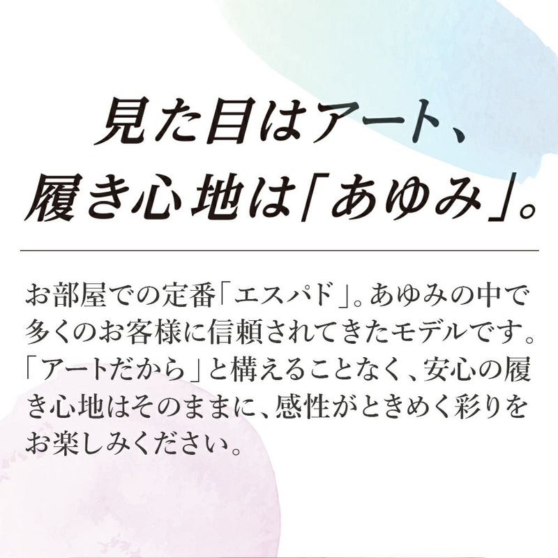 お部屋での定番「エスパド」をベースにしたアートモデル。 安心の履き心地はそのままに、感性がときめく彩りをお楽しみください。