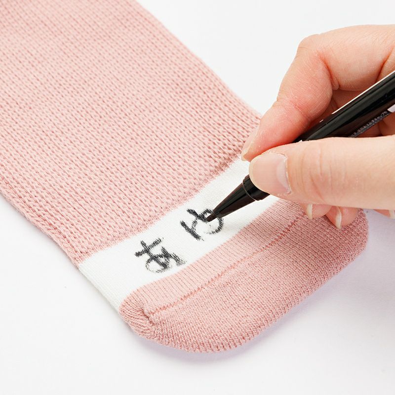 油性ペンで名前が書けます。書く場所はつま先側で外から目立ちにくい。